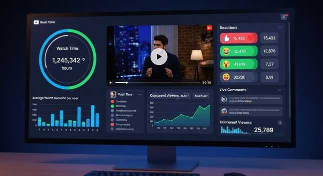 Live streaming engagement analytics dashboard showing views, comments, and watch time